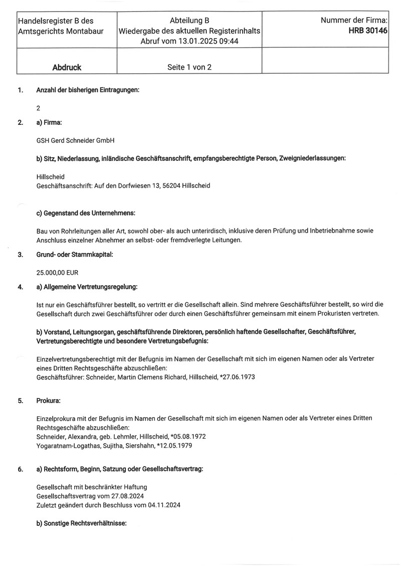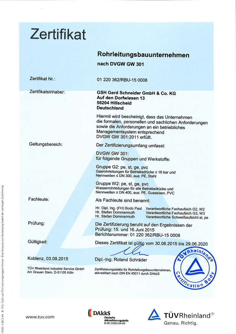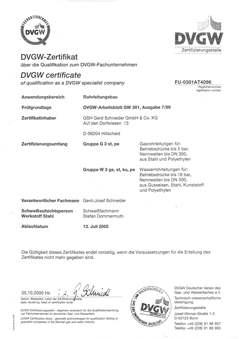 Zertifizierung des Unternehmens nach DVGW-Arbeitsblatt GW 301 in den Klassen G3 und W3. Damit ist die GSH Gerd Schneider GmbH & Co. KG nun als „Fachunternehmen für Gas- und Wasserrohrleitungsbau“ offiziell beim DVGW gelistet.