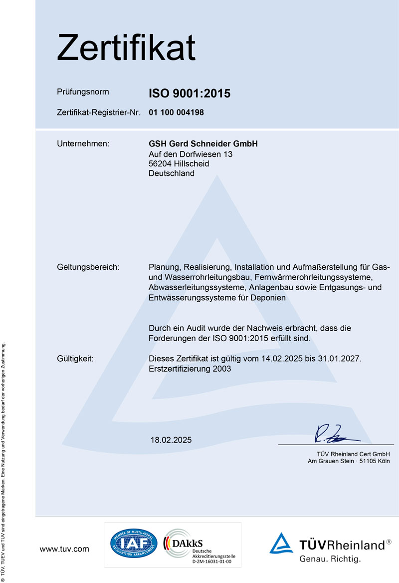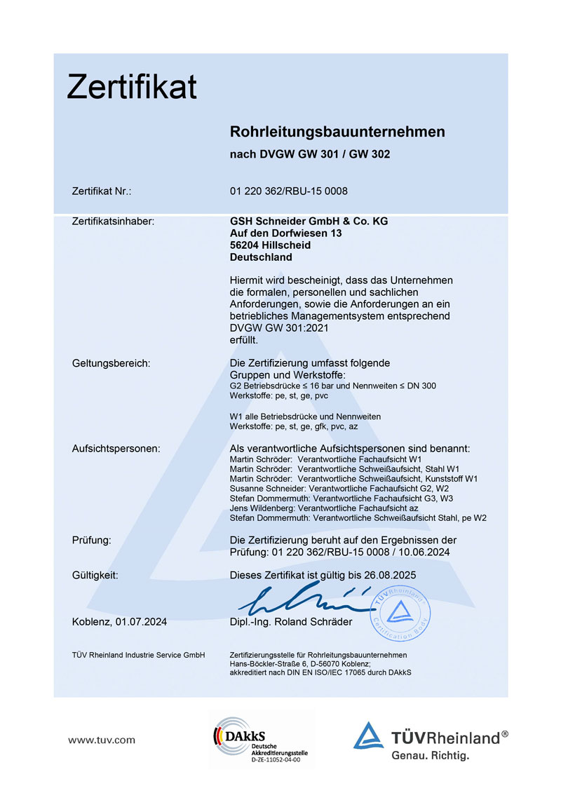Zertifizierung des Unternehmens nach DVGW-Arbeitsblatt GW 301 in den Klassen G3 und W3. Damit ist die GSH Gerd Schneider GmbH & Co. KG nun als „Fachunternehmen für Gas- und Wasserrohrleitungsbau“ offiziell beim DVGW gelistet.